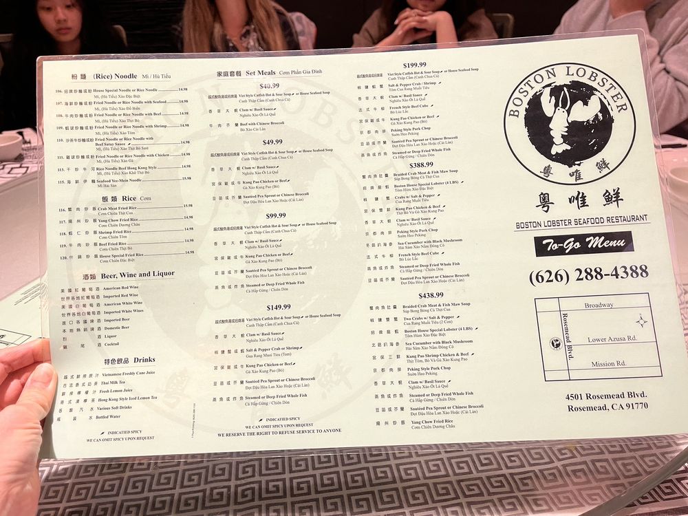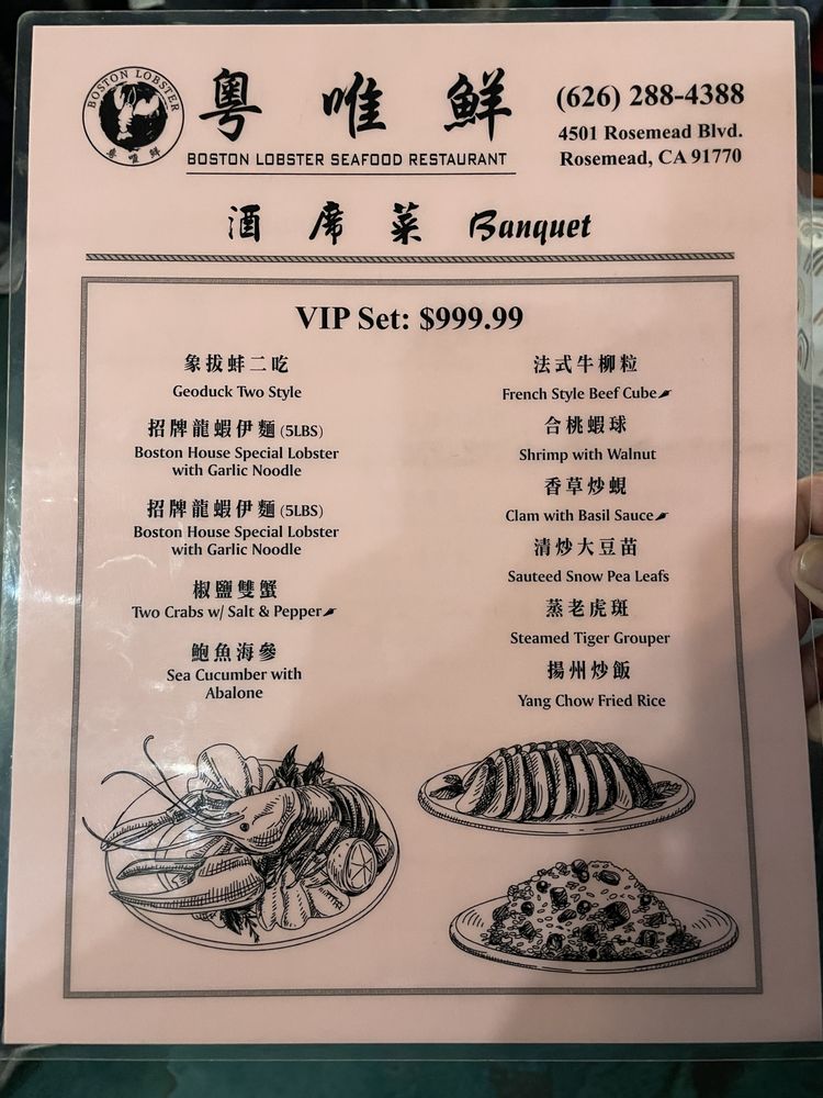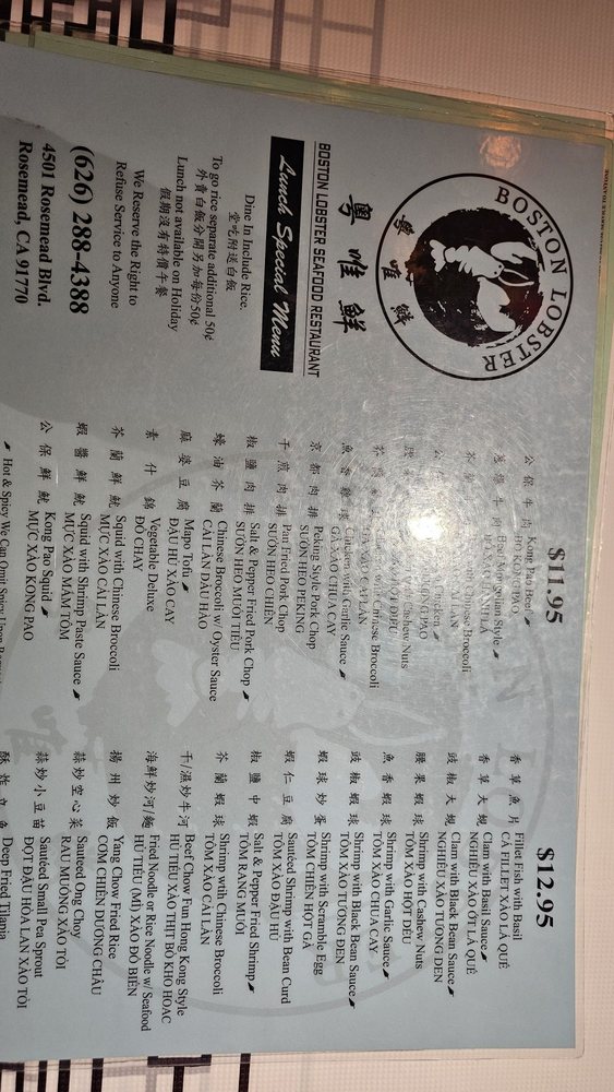 Boston Lobster offers a delightful fusion of Chinese, Vietnamese, and seafood cuisine in Rosemead, CA. With a wide array of menu options for vegetarians and families, this casual restaurant is perfect for lunch or dinner gatherings. The 11-course Sunday dinner is a hit among customers, showcasing generous serving sizes and authentic flavors. The Boston Lobster with house special sauce is a standout dish, along with the Salt and Pepper Pork Chops and Crab with garlic noodles. The ambience is beautiful, service top-notch, and value for money unbeatable. The honey walnut shrimp and French style filet mignon cubes are must-try items that leave a lasting impression. Whether you're looking for a quick lunch or a celebration spot, Boston Lobster exceeds expectations with its delicious dishes and friendly service.